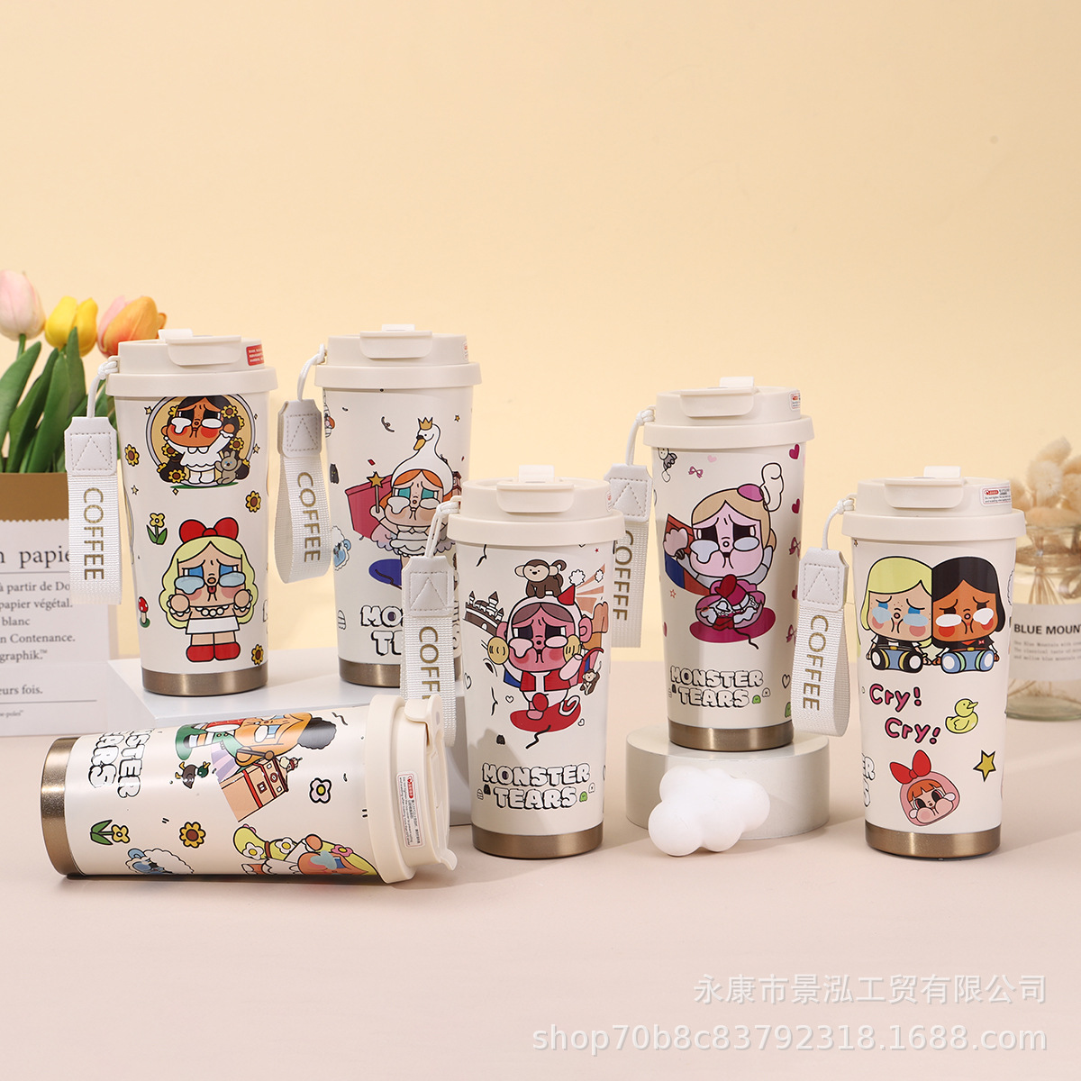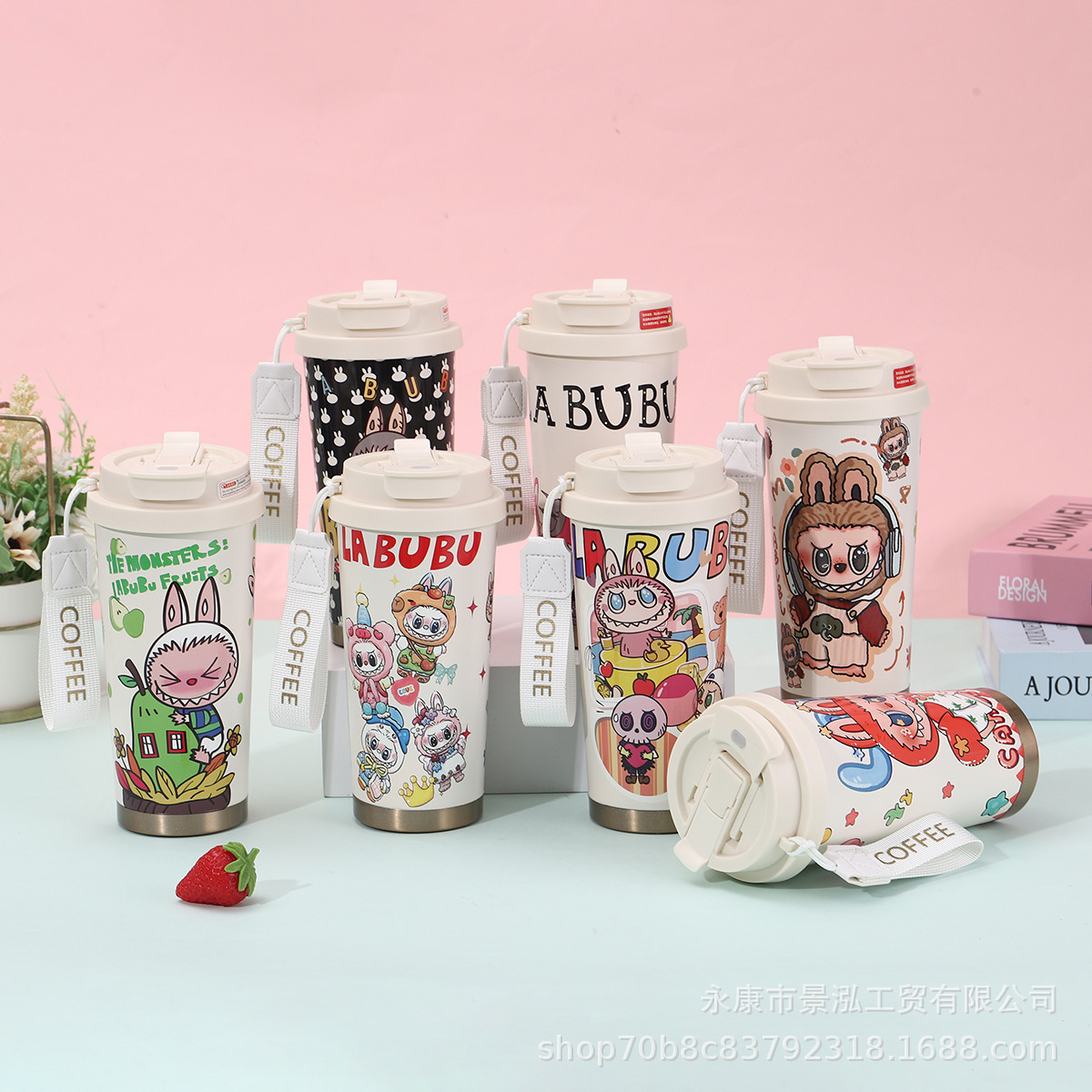 跨境新款316不锈钢保温杯高颜值拉布布图案咖啡杯便携双饮铃兰杯