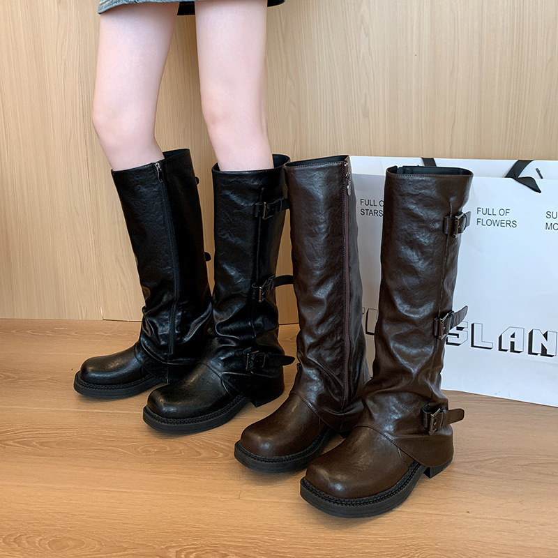 胖mm厚底粗跟皮带扣机车靴子长筒靴女大筒围裤管靴加宽大码女鞋41