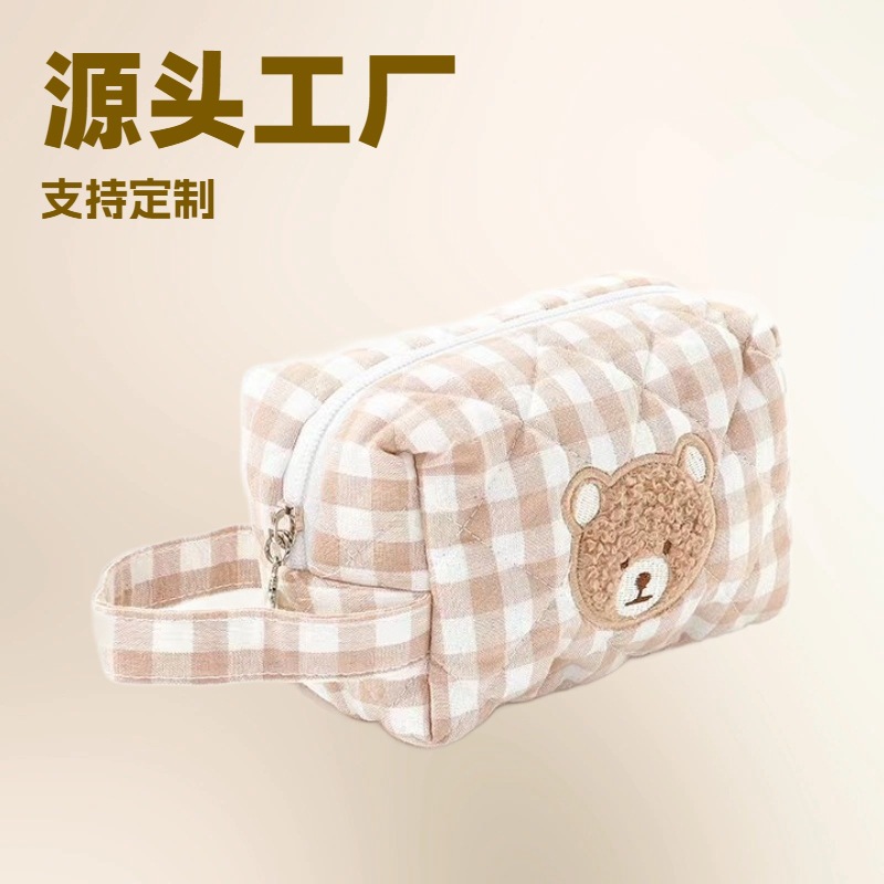 新款绗缝八角化妆包 小熊头像刺绣日常出行手提包 化妆品便携收纳