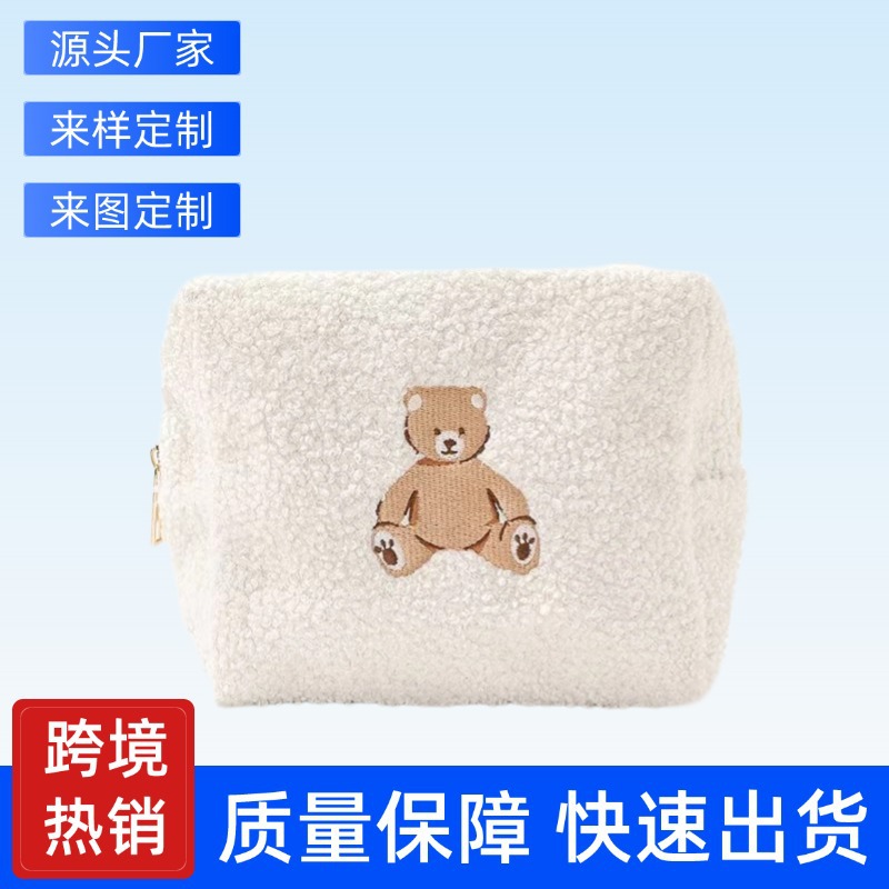 跨境新款八角毛绒化妆包 小熊刺绣洗漱包 立体容量美妆小物收纳包