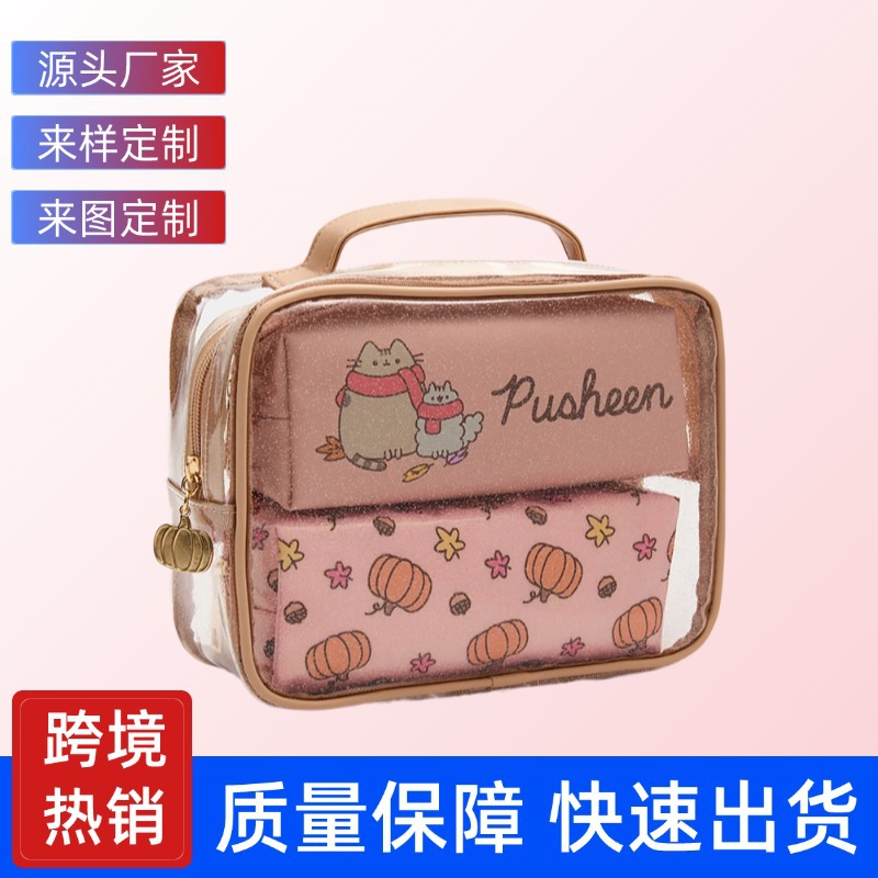 定制猫咪透明三件套化妆包 秋日南瓜元素可爱分装收纳 旅行便携包