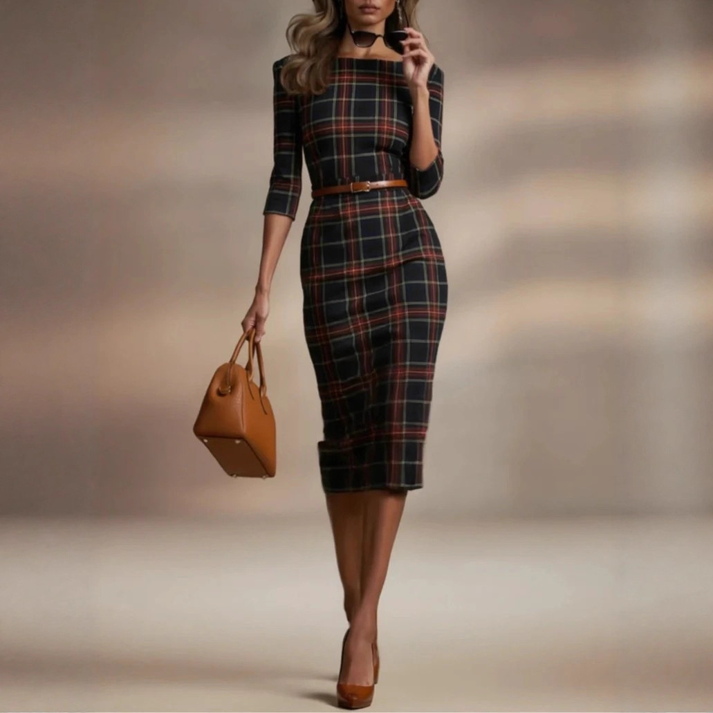 欧美新款亚马逊修身优雅经典格子船领紧身跨境女装显瘦连衣裙
