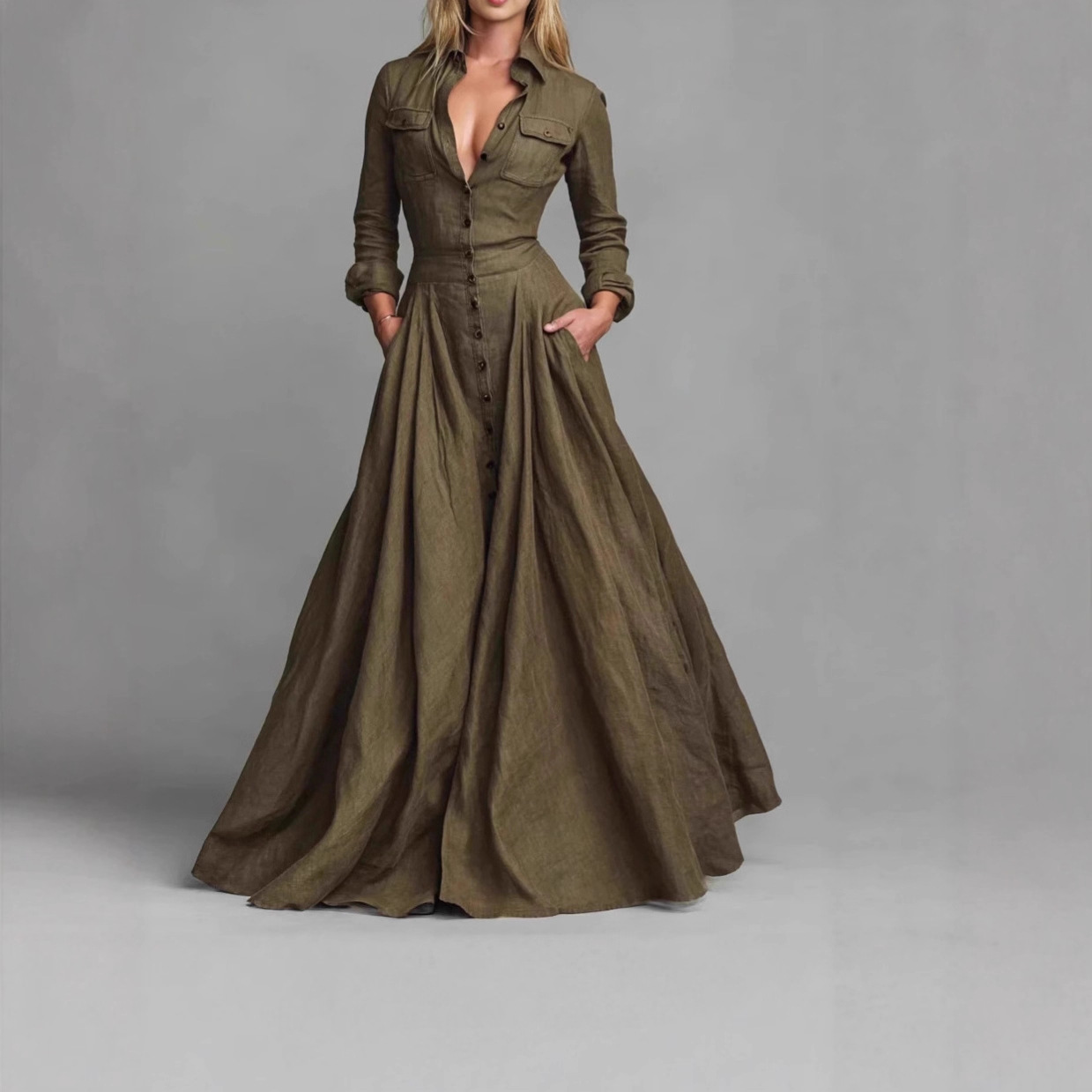 亚马逊跨境时尚女装长袖翻领连衣裙欧美气质优雅高腰显瘦大摆裙子