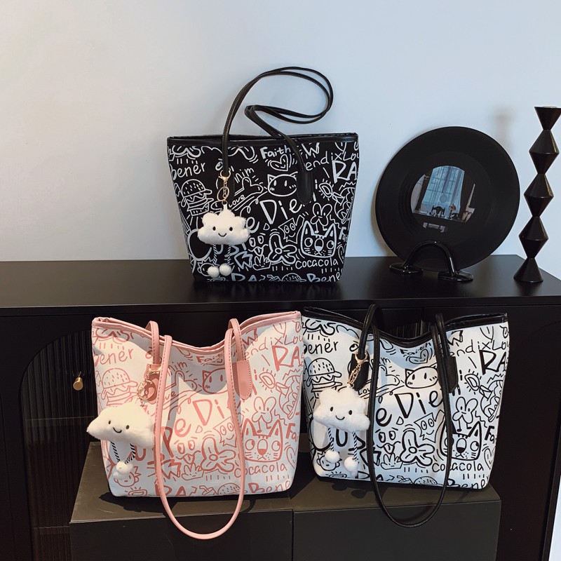 新款休闲百搭帆布涂鸦单肩包通勤上班手提包批发大容量时尚女包包