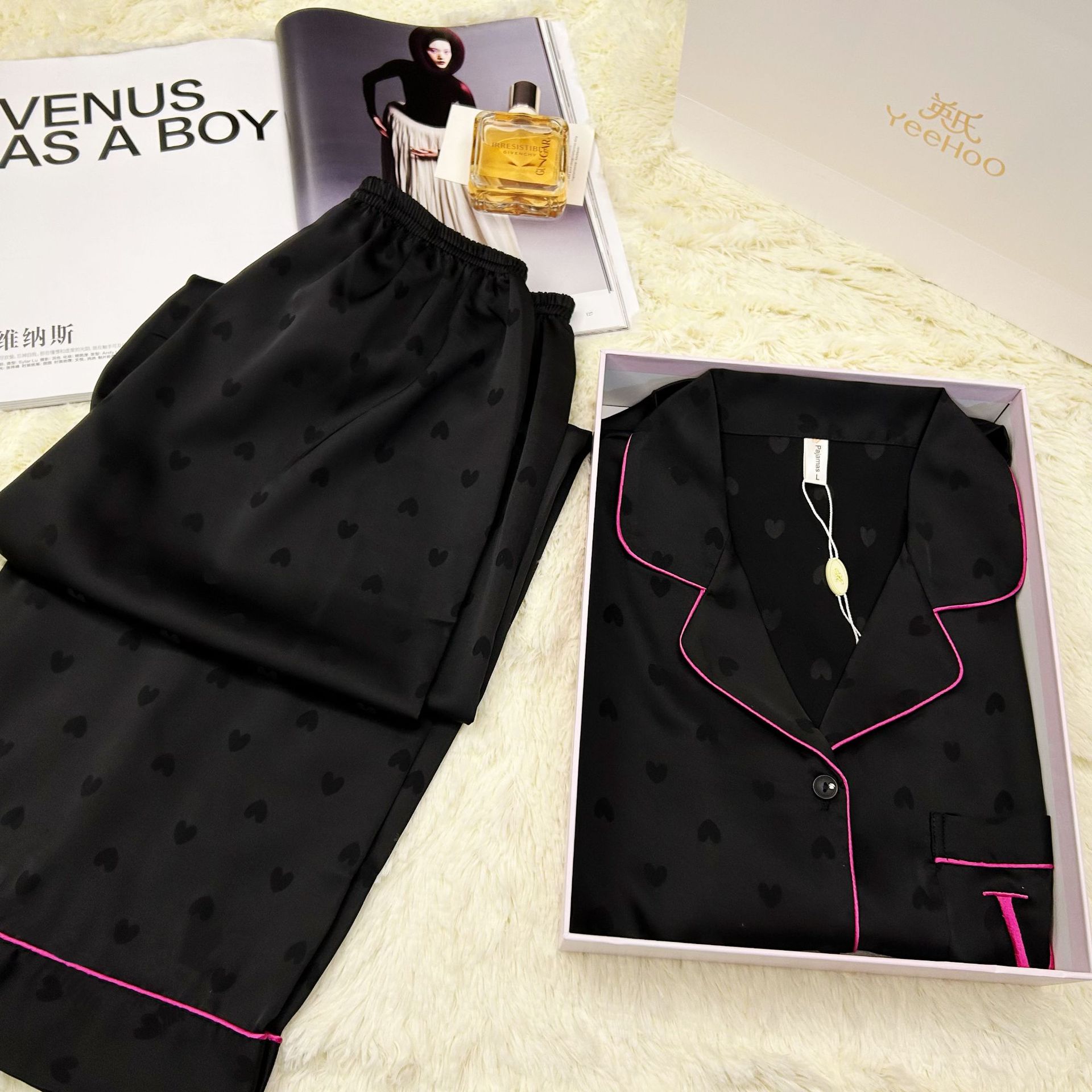 睡衣跨境爱心提花冰丝冰长袖长裤女睡衣小红书同款家居服套装外贸
