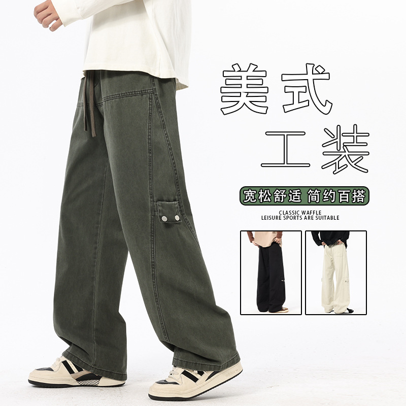 美式工装裤男士秋冬潮流新款宽松直筒纯棉阔腿休闲裤军绿色裤子男