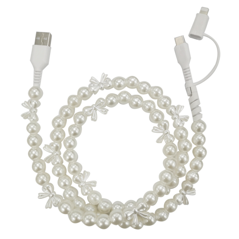创意礼品时尚手工串珠线 一拖二珍珠蝴蝶结彩珠数据线二合一定制