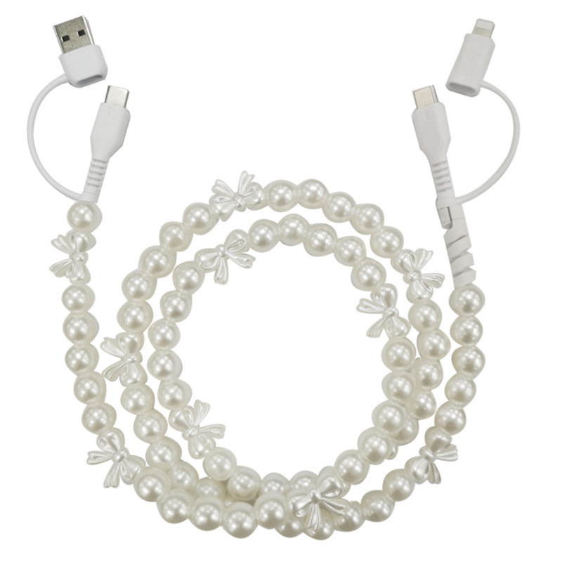 二拖二粉珍珠串珠数据线 4合1手工彩珠线四合一手机充电线批发1m