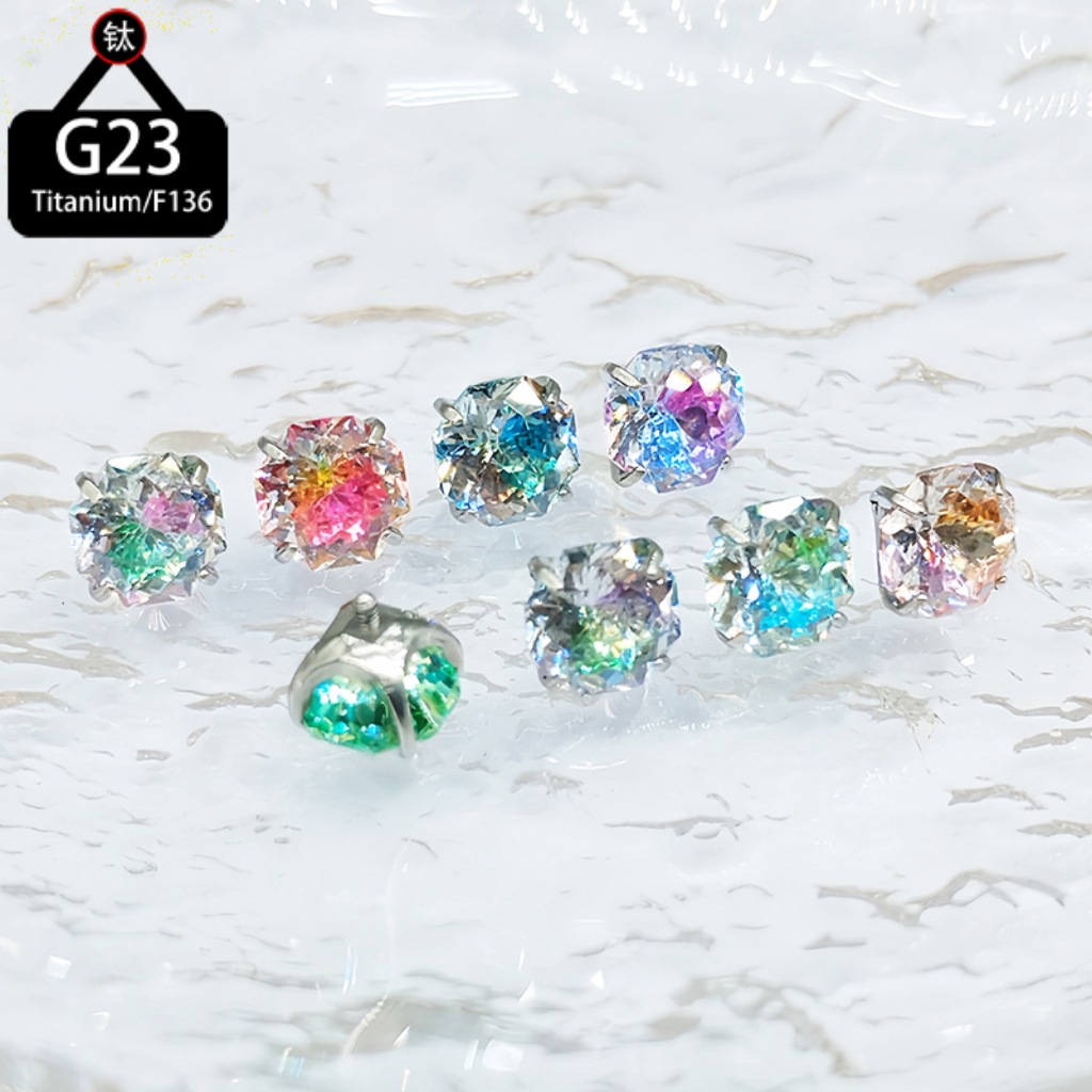 F136钛合金天火渐变玫瑰切耳钉八边手捧花锆石内螺纹耳骨钉饰品头