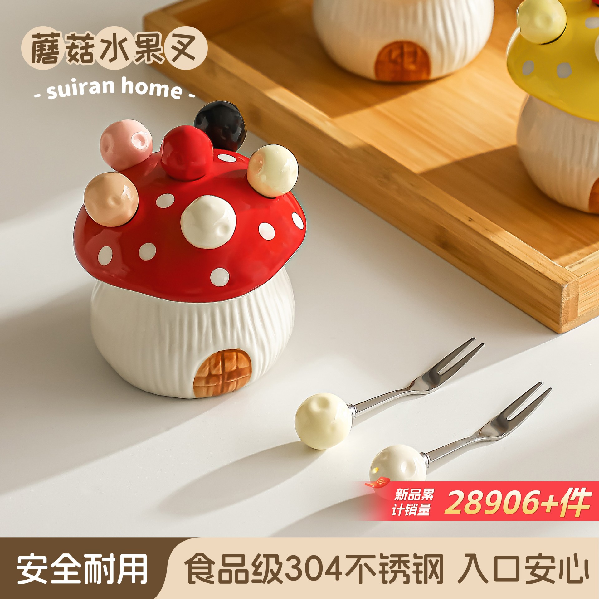 蘑菇水果叉套装家用不锈钢甜品可爱小叉子收纳罐果插儿童安全果签