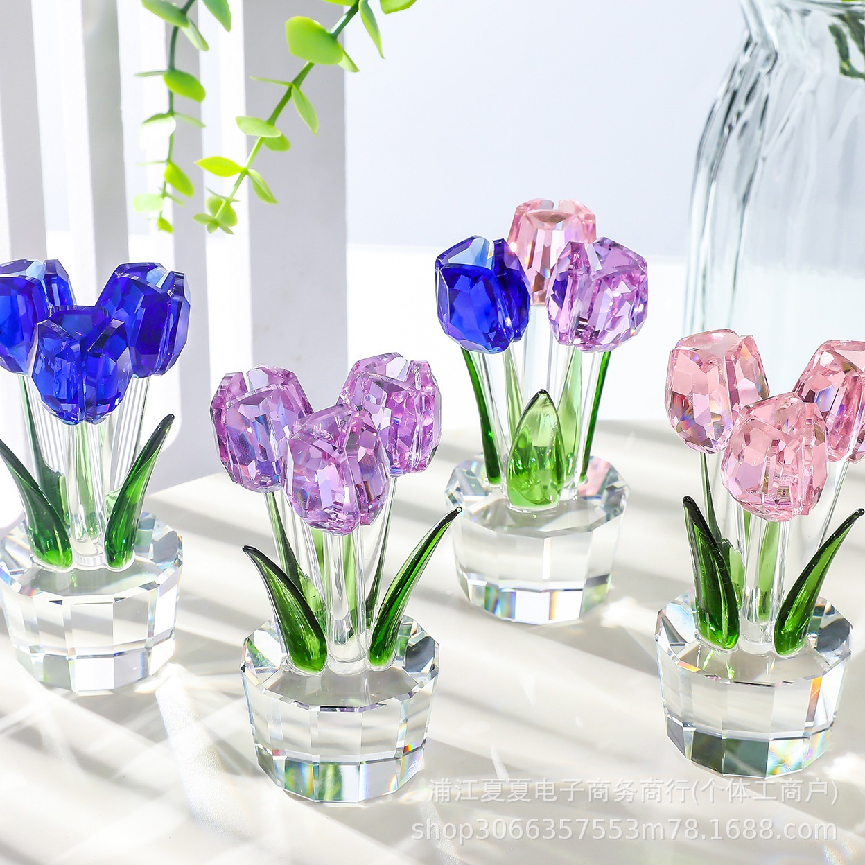 郁金香玻璃花雕像 水晶装饰收藏品 粉红色水晶花束摆件 周年纪念