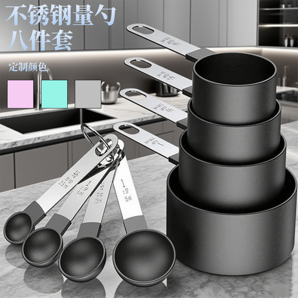 家用厨房带刻度量匙套装430不锈钢手柄量勺塑料量杯8件套工厂直销