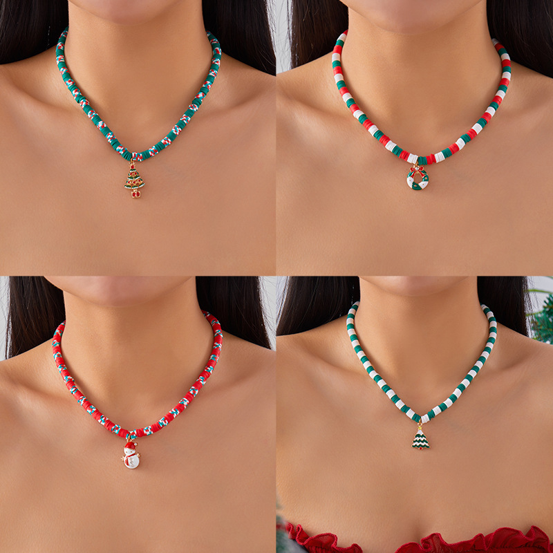 跨境热销新款圣诞节饰品欧美风时尚红绿白软陶弹力圣诞树吊坠项链