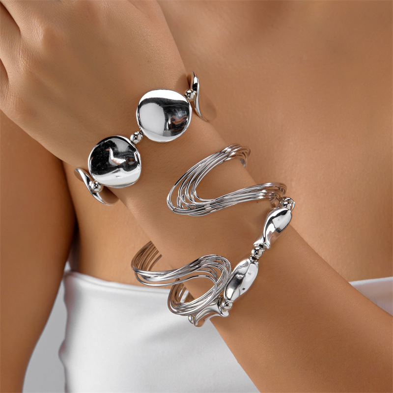 欧美跨境时尚夸张手饰 小众不规则多层线条缠绕几何开口手镯3件装