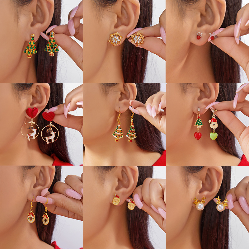 厂长直销圣诞节日饰品时尚百搭款圣诞树麋鹿水钻画油耳环礼物批发