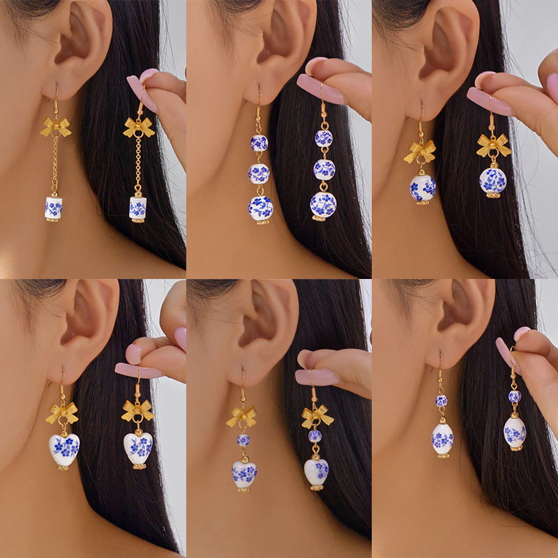 跨境电商热销耳钩古风国潮新款小众复古青花瓷陶瓷珠串珠长款耳环