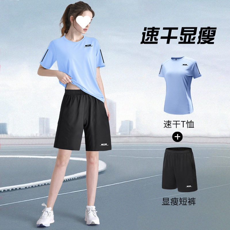 跑步套装女夏季速干冰丝T恤运动瑜伽服大码宽松短袖晨跑健身衣服