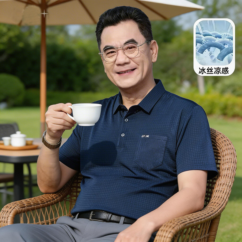 夏冰丝清凉POLO高端中年爸爸短袖商务休闲翻领口袋T恤衫男衬衫领