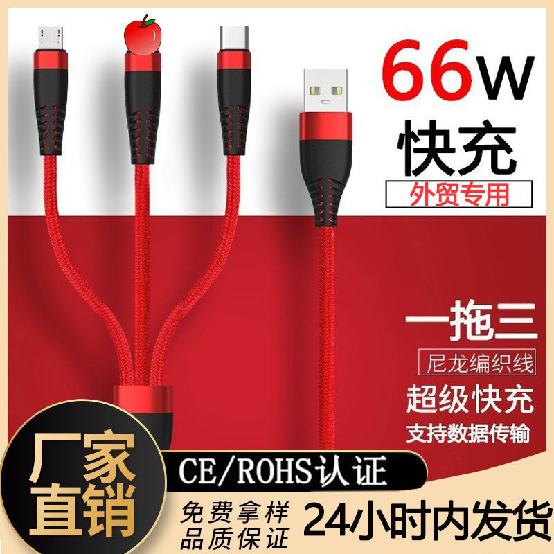 66W一拖三编织快充数据线3A适用安卓苹果type-c三合一手机充电线