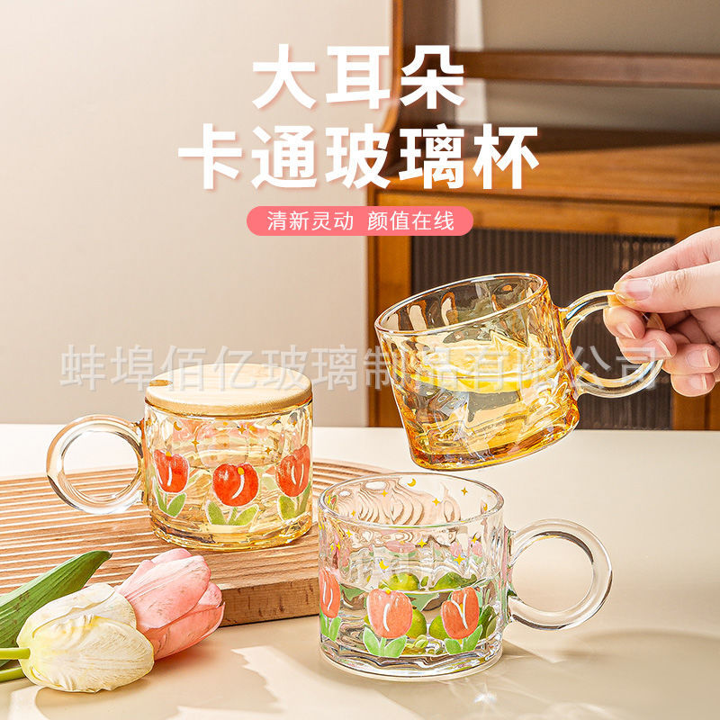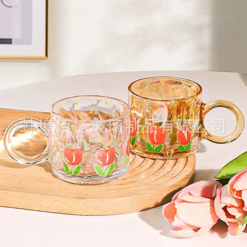 轻奢郁金香玻璃杯ins风印花高颜值把手杯夏季饮品果汁杯礼品杯