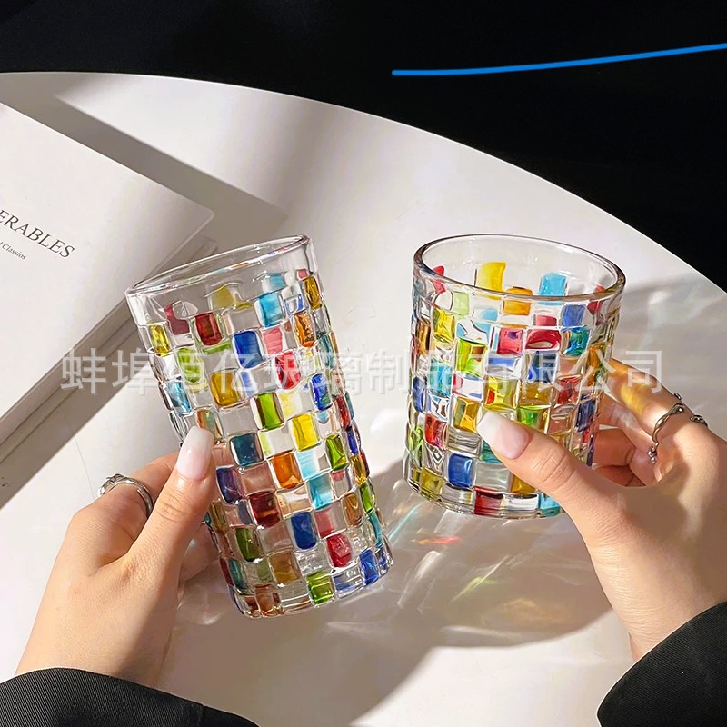 会折射彩虹光藤编杯中古方块格子玻璃杯手绘设计感小众威士忌酒杯
