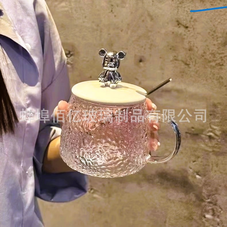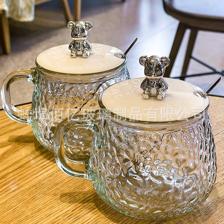 创意ins玻璃马克杯小熊水杯带把手家用带盖早餐杯子福利礼品代发