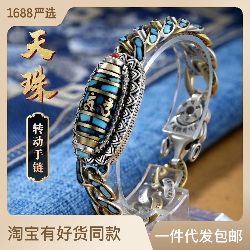 wish跨境手链男纯六字真言可旋转潮款宽版男士霸气个性大气复古手
