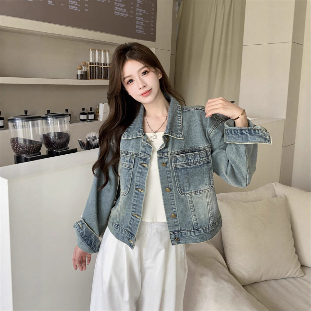 依号家 复古高级感短款牛仔外套女秋新款百搭洋气设计感夹克上衣