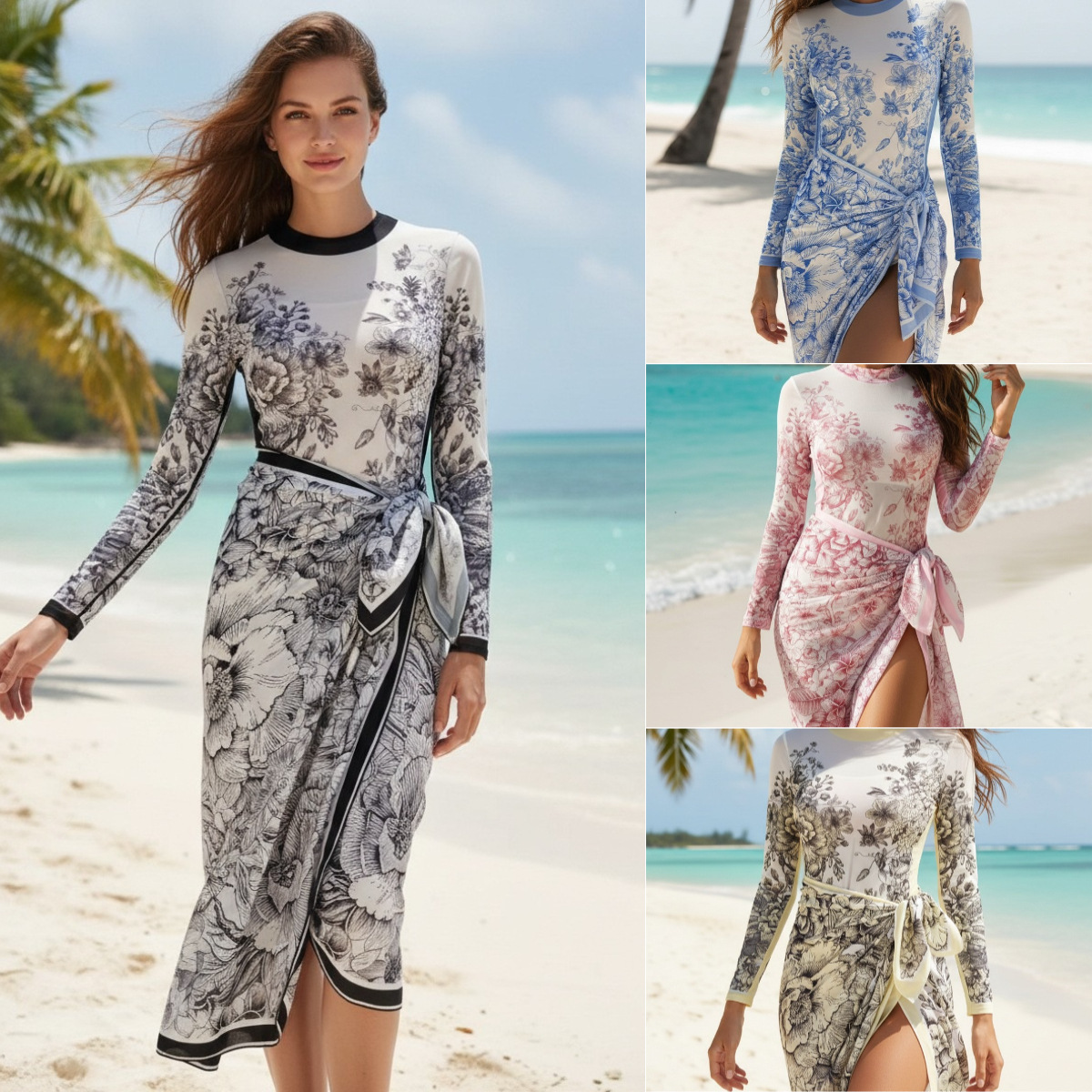 欧美泳衣女2026新款长袖拉链多件套多个印花性感泳装保守海边度假
