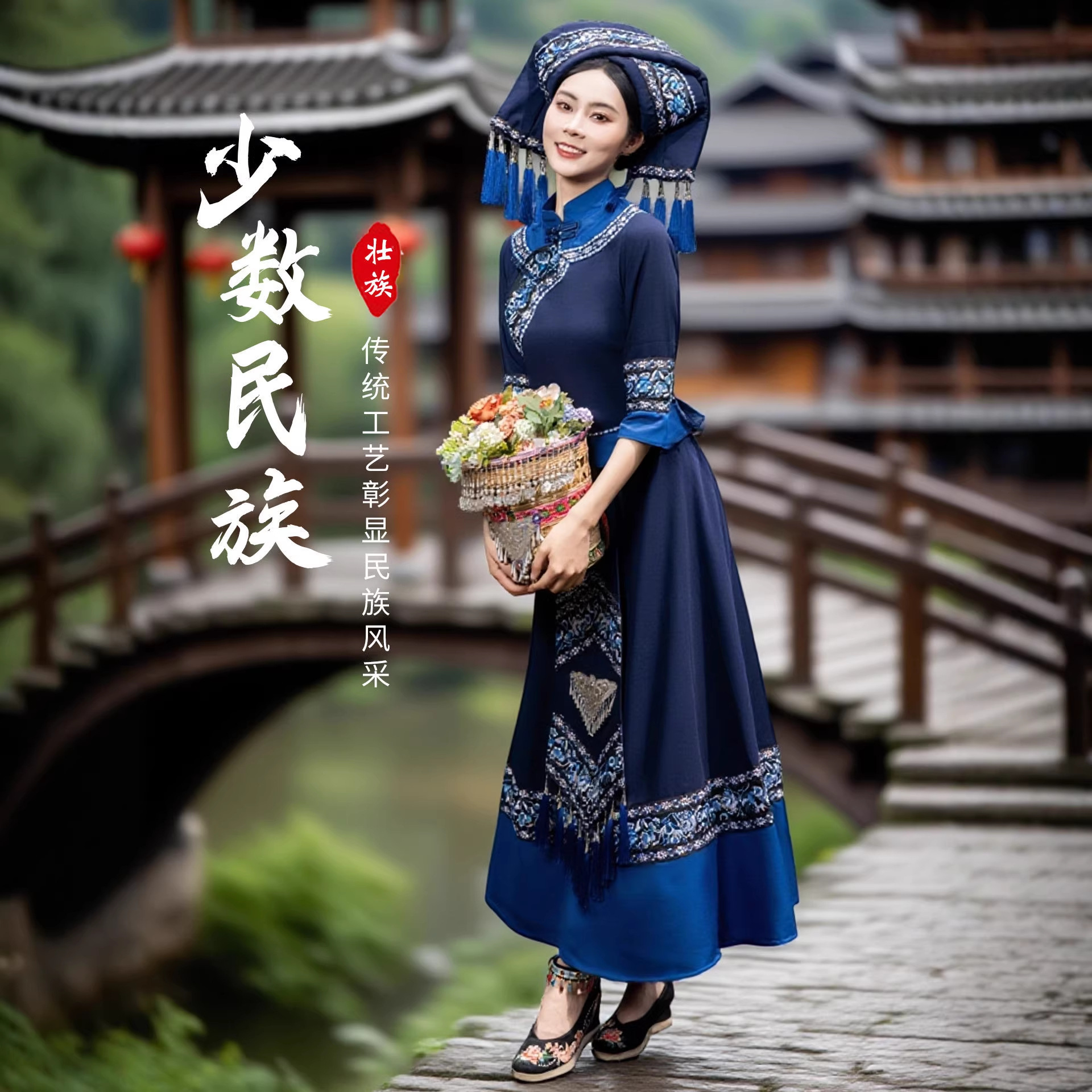 广西壮族服装三月民族演出服饰少数民族演出服成人壮锦刺绣长裙
