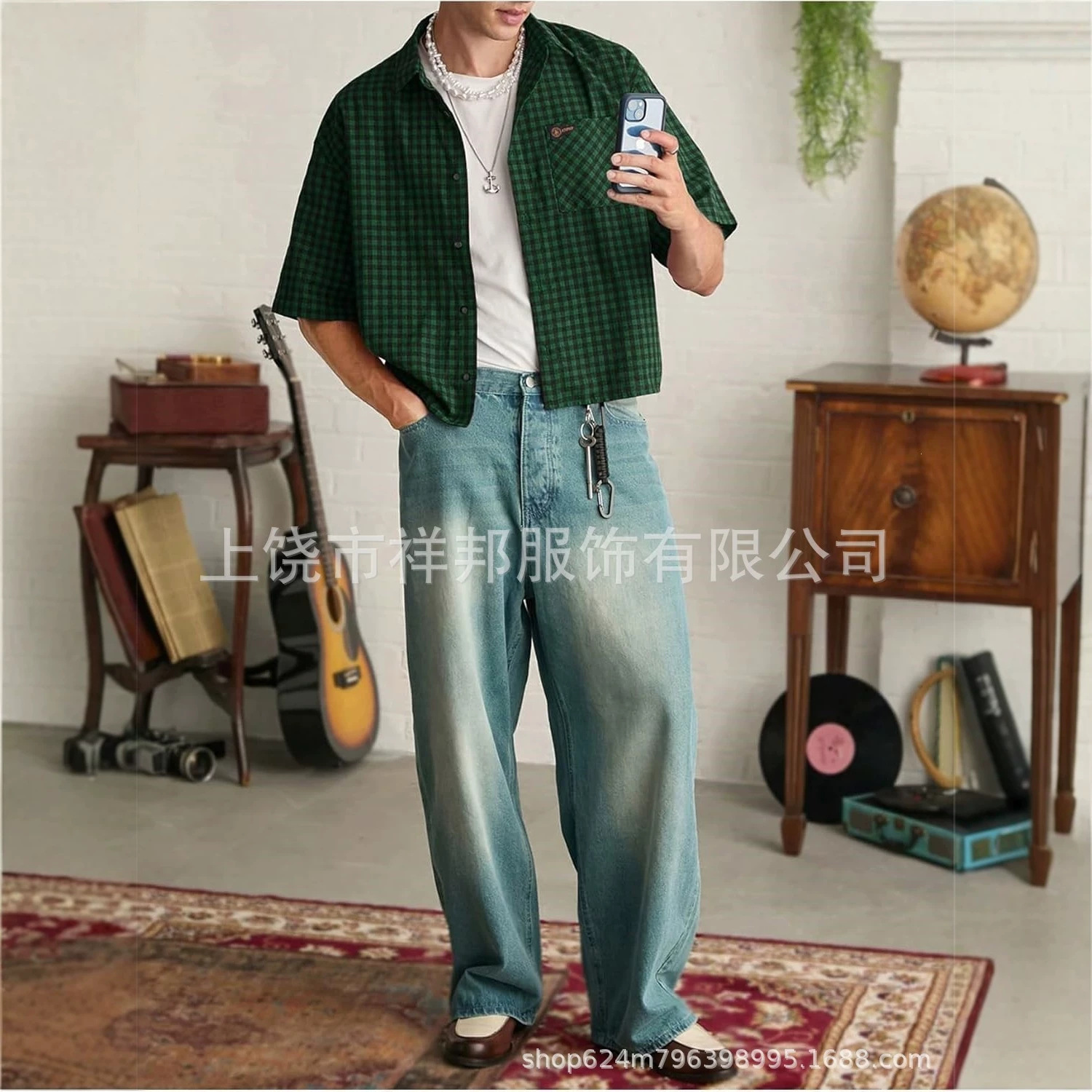 美式y2k复古绿色格纹单口袋 短袖衬衫男夏季宽松休闲百搭短款衬衣