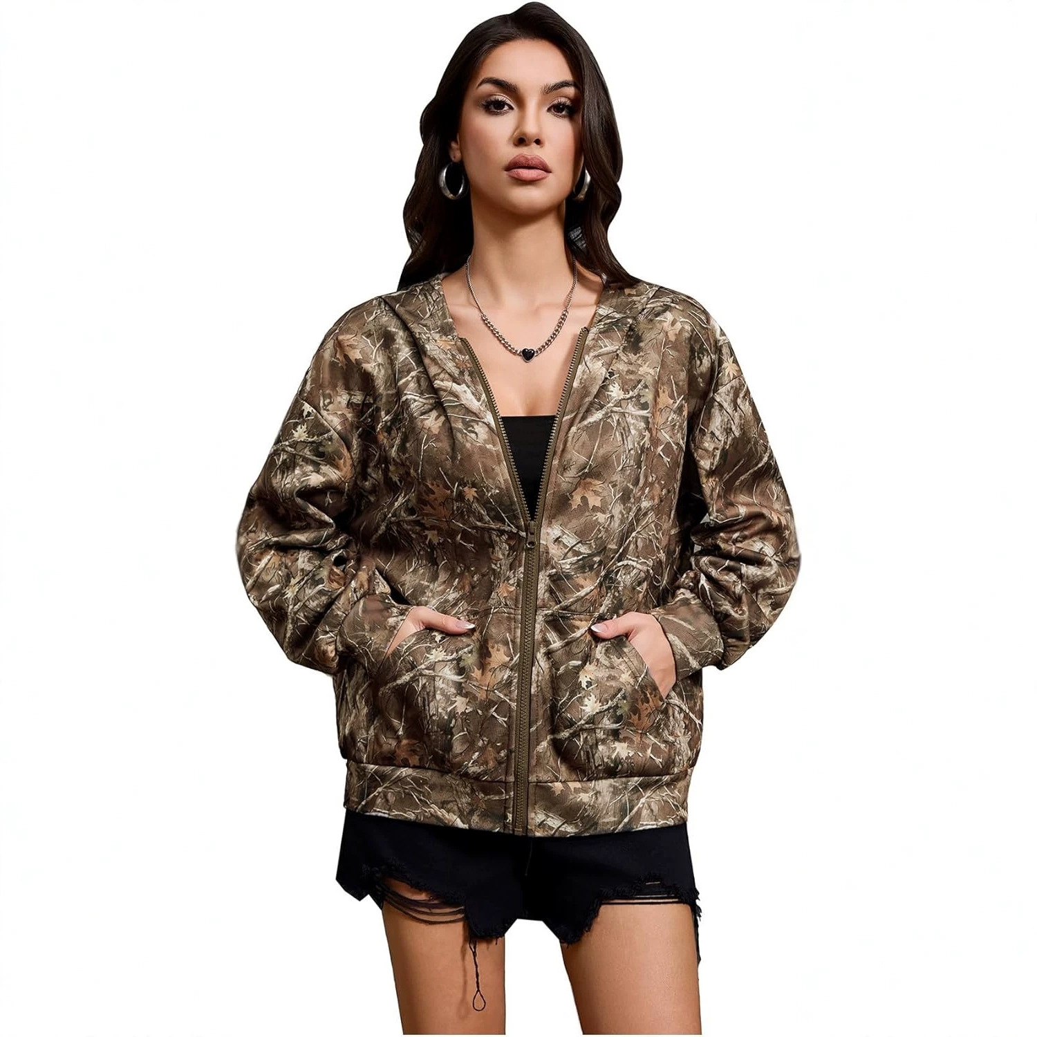春秋新款女式 Y2k迷彩连帽衫复古落肩街头运动衫3D带口袋拉链卫衣