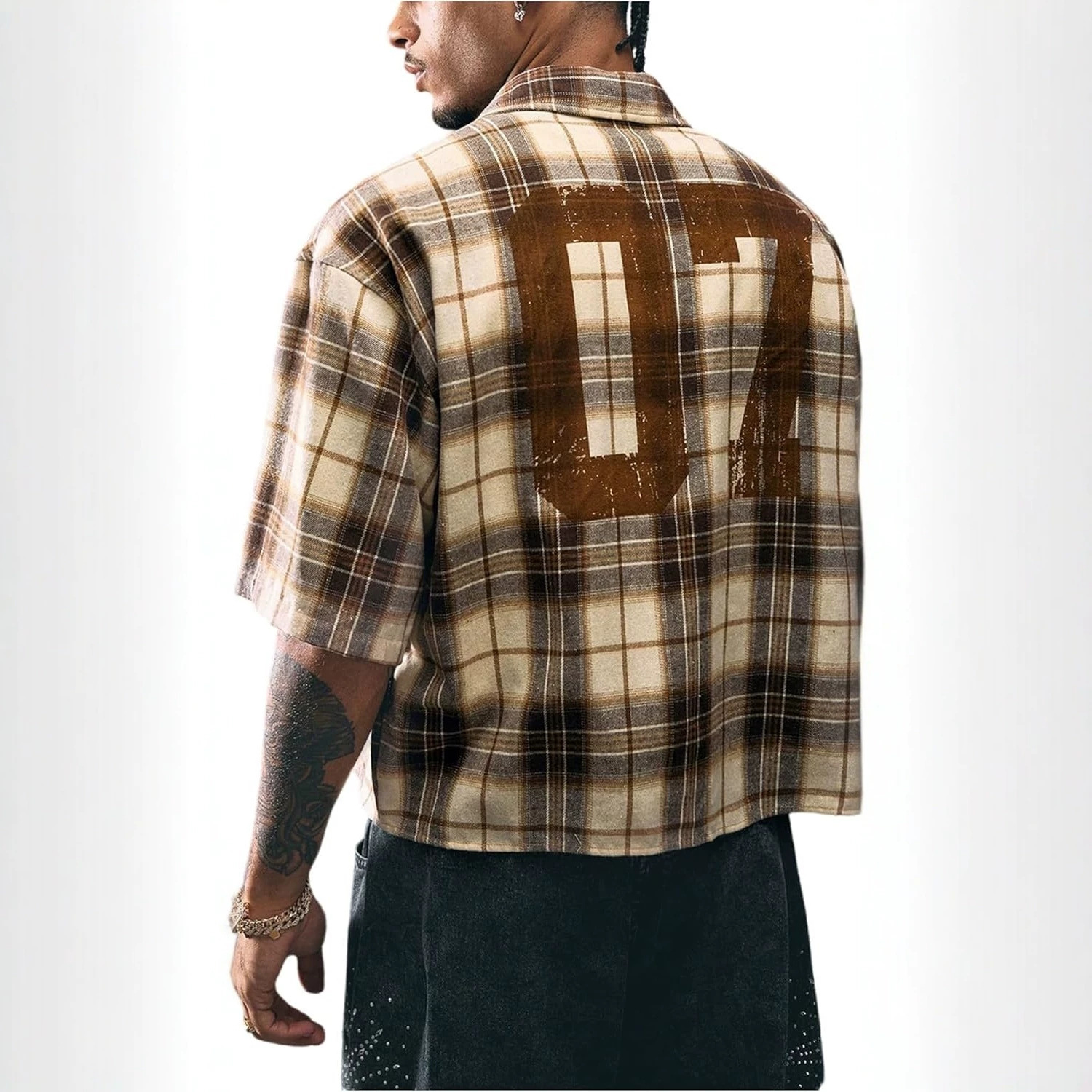 夏季新款男式格子短款衬衫纽扣数字图形宽松短袖度假Y2K休闲 T 恤