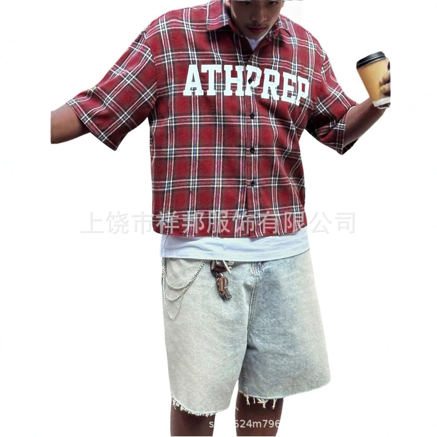 夏季新款美式复古字母印花红格纹短袖衬衫男式休闲情侣款百搭上衣