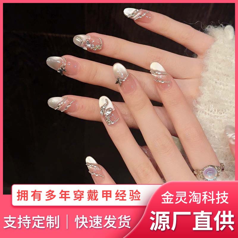 裸色穿戴甲法式猫眼穿戴甲爆闪轻奢显白新款蝴蝶蝶春蛇手工穿戴甲