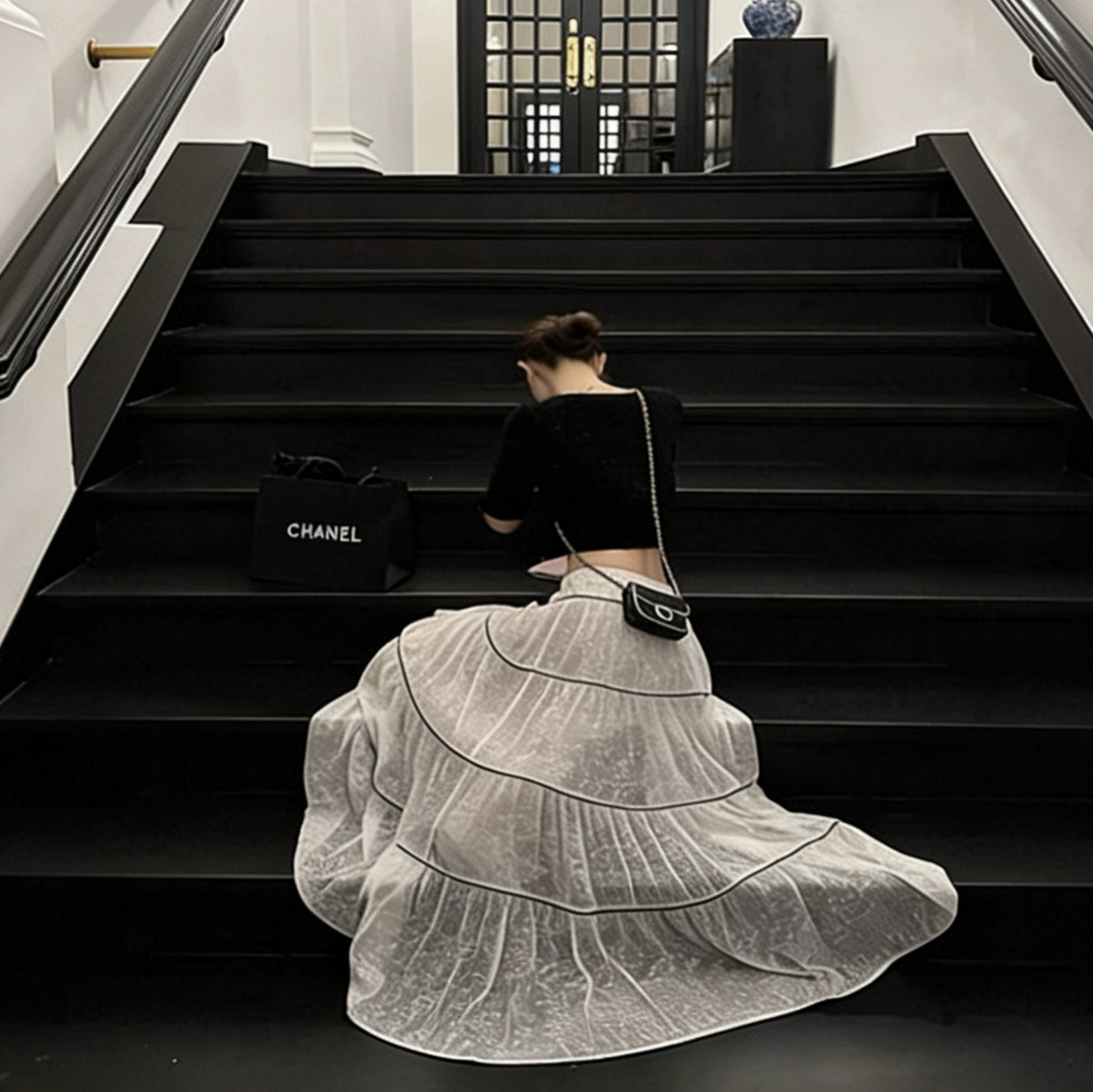 板栗可可Bankelili'黑曜石千金'小香风粗花呢短袖/蕾丝半身裙套装