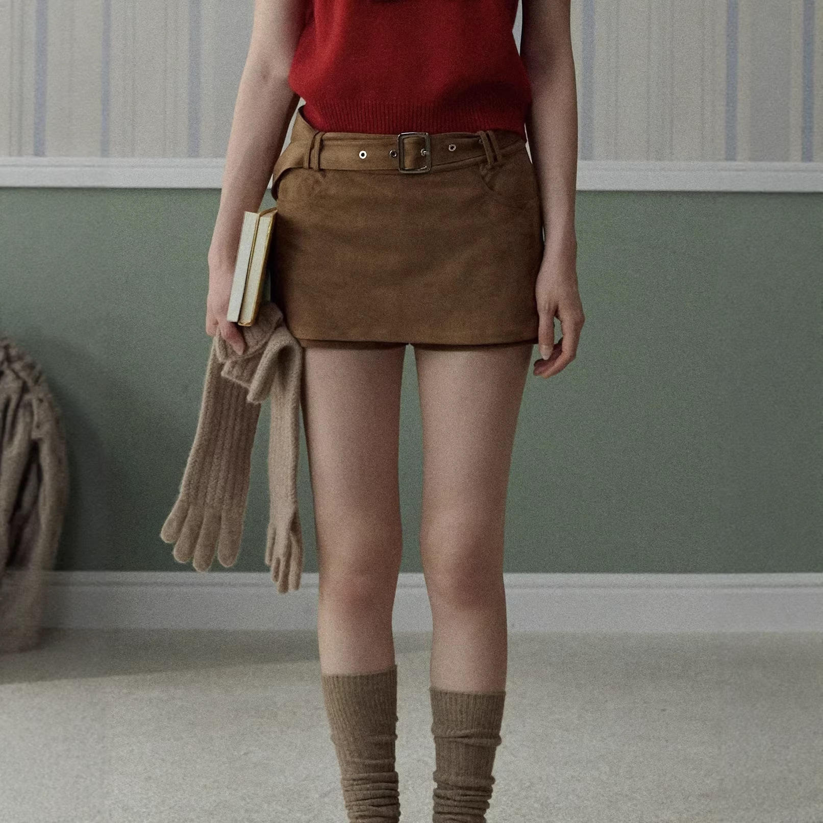 LaluneDuCie 麂皮绒腰带短裙裤女美拉德半身裙
