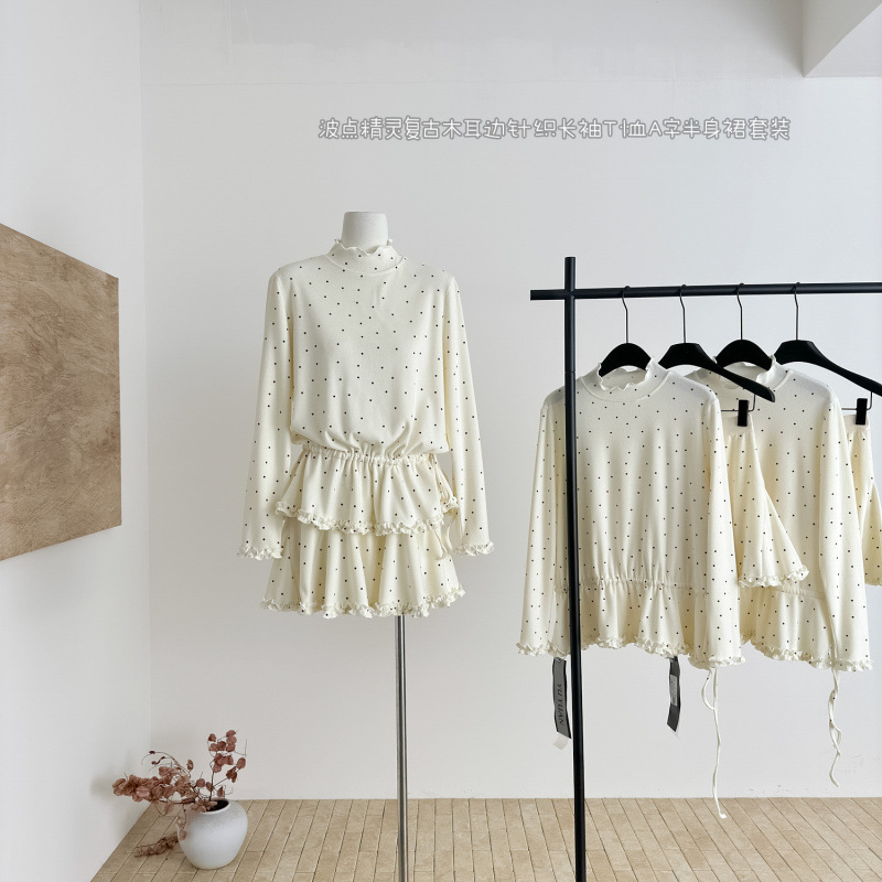 有耳uare原创设计 波点精灵 复古木耳边针织长袖T恤A字半身裙套装