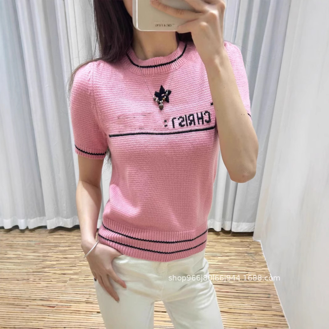 针织短袖D家五角星条纹25早春南油高版全羊毛衫字母提花泡泡袖T恤