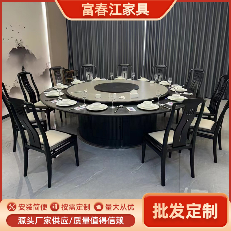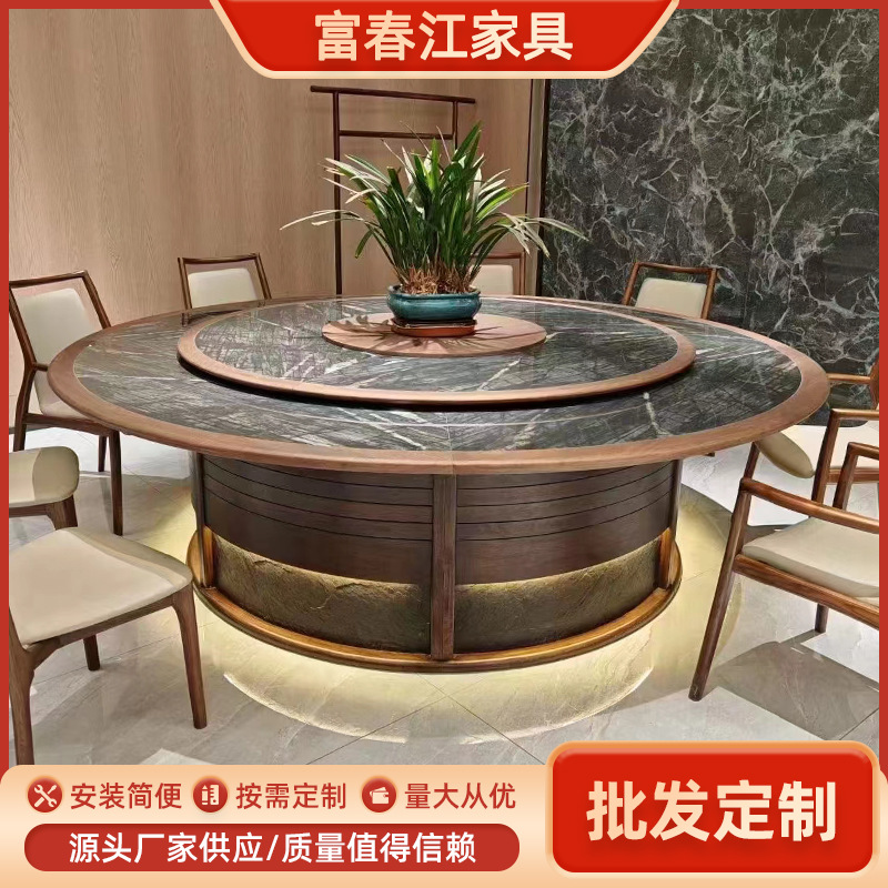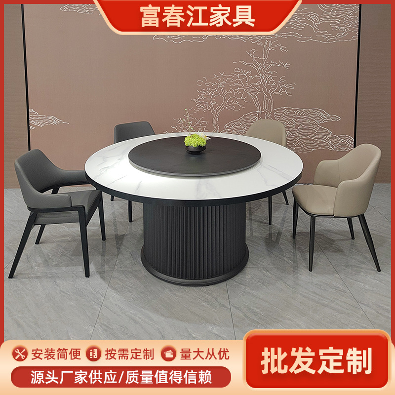 酒店餐桌包间电动大圆桌火锅电磁炉一体桌子别墅家具轻奢岩板餐桌