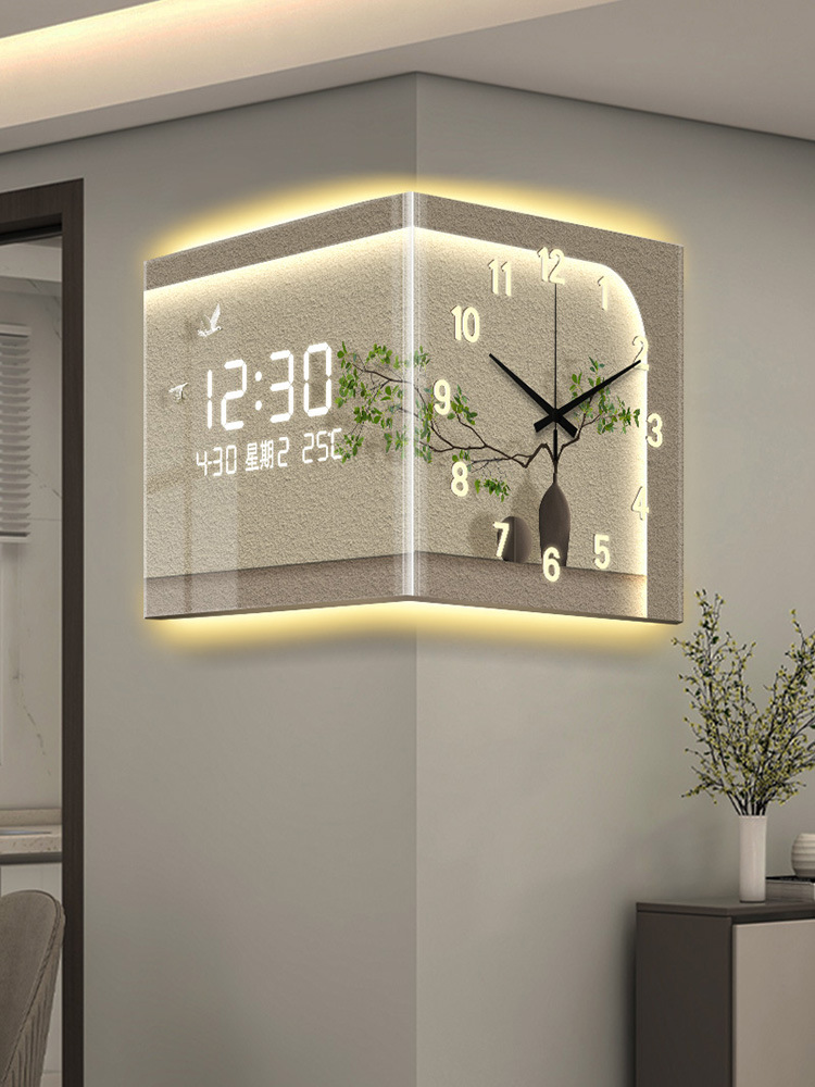 免打孔绿植转角时钟挂墙自动对时挂钟客厅创意高级感壁灯电子钟表