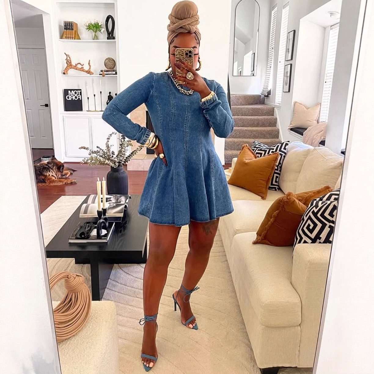 欧美女式褶皱牛仔伞裙亚马逊跨境女装秋冬新款时尚拼接牛仔连衣裙