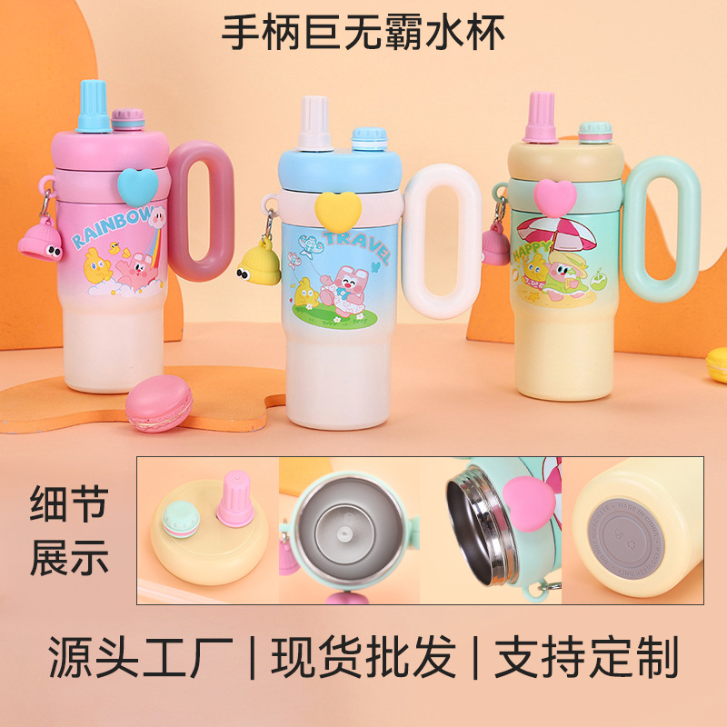 跨境316不锈钢真空保温杯ins卡通涂鸦吸管杯手柄巨无霸水杯ins风