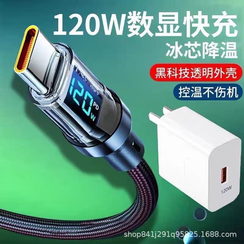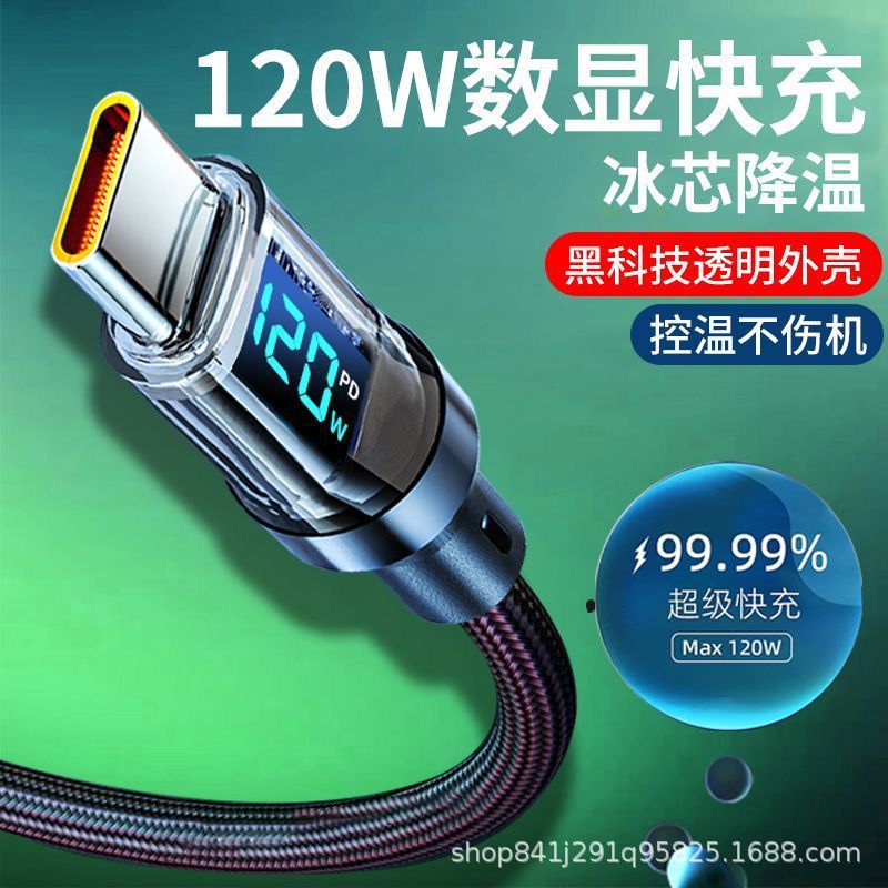 批发冰透数显120W超级快充数据线 适用于苹果15-16华为编织充电线