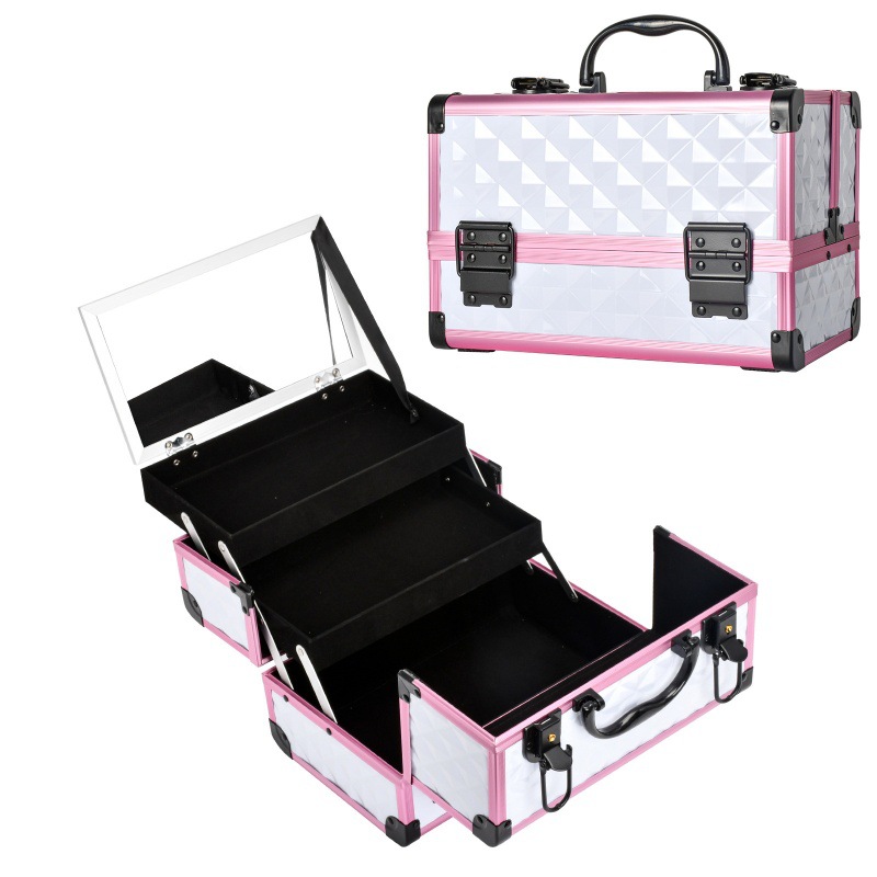 新款化妆箱便携铝框收纳箱三层双开大容量化妆箱美甲纹绣美容工具