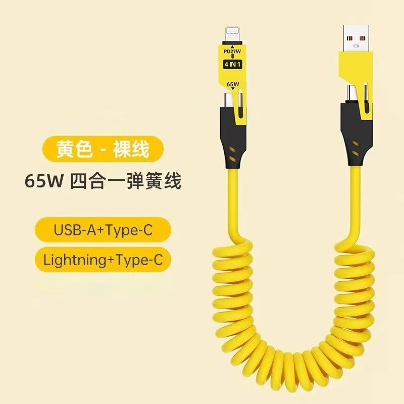 车载65W弹簧数据线四合一便捷伸缩超级快充线适用华为苹果充电线
