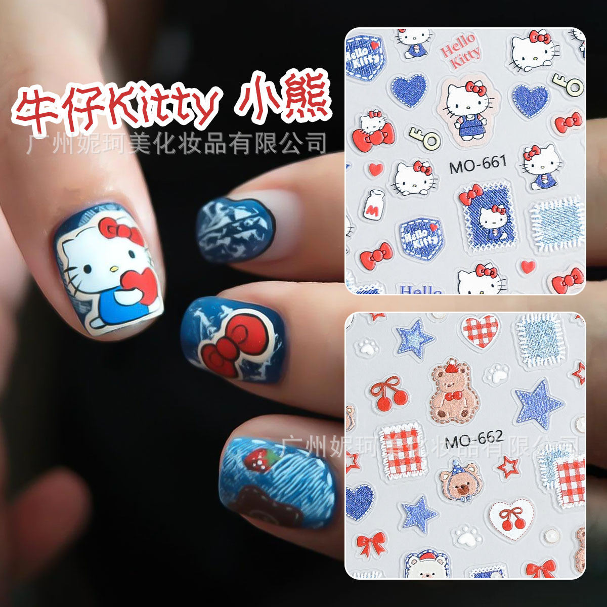 浮雕可爱卡通甜酷风美甲装饰贴新款牛仔Kitty小熊小狗美甲贴纸663