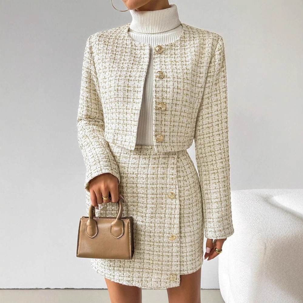 欧美外贸2025批发秋季新款排扣饰纹理圆领短款外套纽扣包臀裙套装