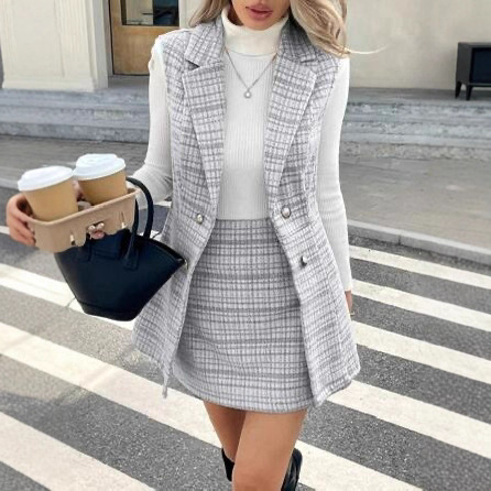 欧美跨境2025亚马逊秋季女新款纹理双排扣西装外套包臀裙休闲套装