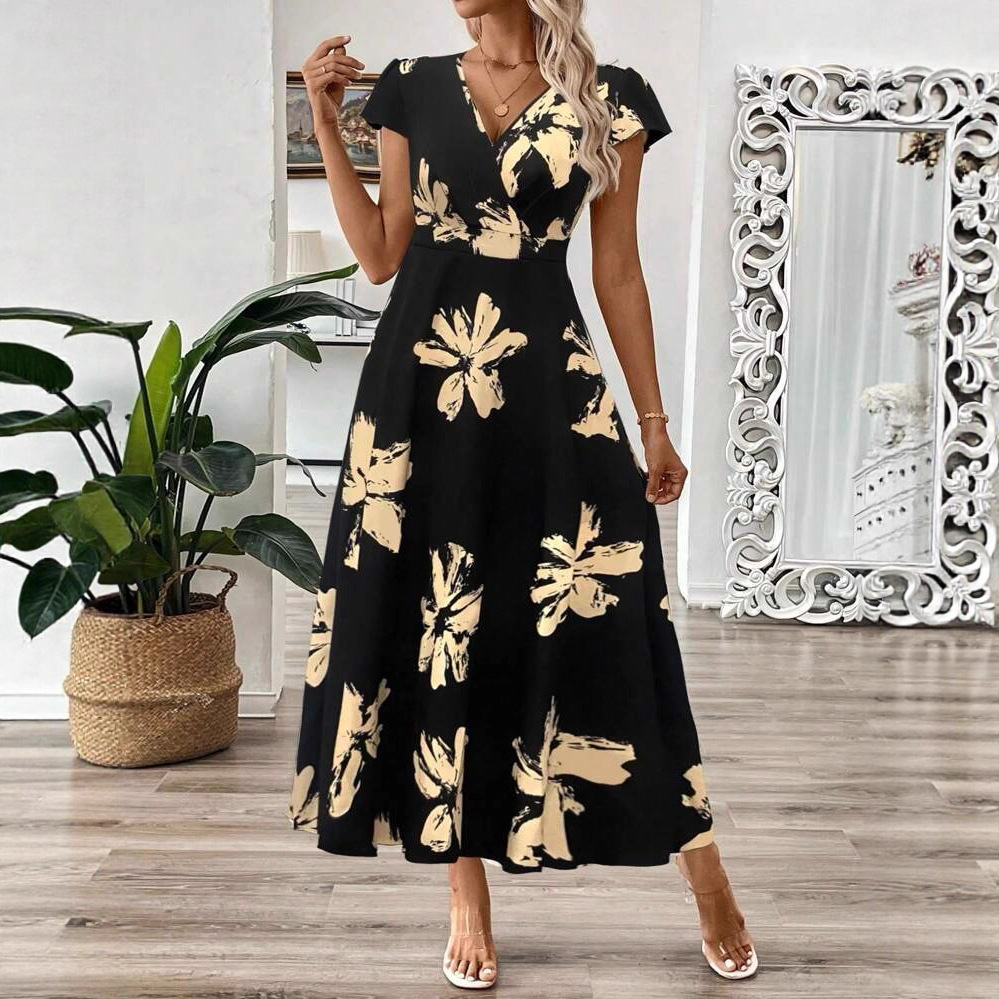 欧美亚马逊外贸跨境2025女装新款时尚休闲印花V领短袖收腰连衣裙